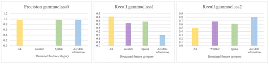 (B) Ablation study: The second analysis is an ablation study aiming to explore the importance of each feature category when used individually for predicting accident impact. Here, we study three categories of features—weather, spatial, and accident information—and compare their results with the case of using all categories of features. By systematically evaluating model performance with each category—weather, spatial, and accident information—used in isolation, we assess the extent to which each group contributes unique and complementary information to overall prediction accuracy. Figure 19 shows the analysis results, and it reveals that removing all but one feature category would significantly degrade the prediction results. In comparison to the best model results, using each category alone as an input would result in greater recall for = 2, lower recall for = 1, and almost the same precision for = 0 (except for the weather category). It is worth noting that using just weather features does not assist in identifying cases where = 0. This can either indicate that the quality of weather data in our dataset is not as good as it should be (e.g., it could be finer-grained spatially and temporally), or that weather characteristics do not play an important role in the area of our study (throughout the year, we do not usually see significant shifts in weather conditions in the Los Angeles area (see https://weatherspark.com/y/1705/Average-Weather-in-Los-Angeles-California-United-States-Year-Round (accessed on 3 June 2025) for more details)). This analysis demonstrates that effective accident impact prediction relies on the integration of all feature categories, as the exclusion of any single group yields a marked decline in model performance. The ablation results support the conclusion that weather, spatial, and accident information each provide distinct, complementary signals that are essential for maximizing predictive accuracy across different impact classes.