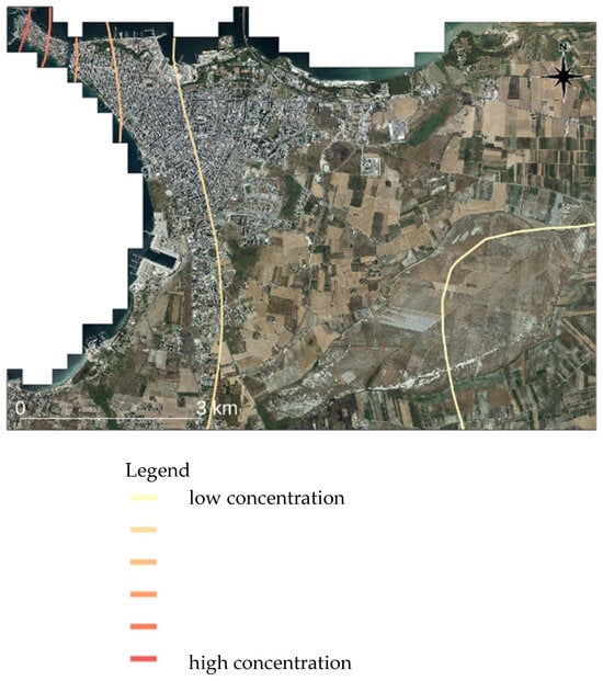 The analysis of exposure to fine dust was carried out by identifying and classifying the theoretical values of the annual mean concentration of PM10 (expressed in μg/m3) using the results of the AERMOD environmental modelling software. The fallout maps were generated using QGIS software (version 3.22), integrating the AERMOD output data using spatial interpolation and isoline representation (Figure 3). The concentration values were classified by order of magnitude to distinguish the areas with different exposure intensities and facilitate the reading of the pollution gradients. This cartographic representation allows for identification of the areas of greatest environmental criticality, offering visual and analytical support to territorial planning and the definition of mitigation measures based on the targeted application of nature-based solutions.