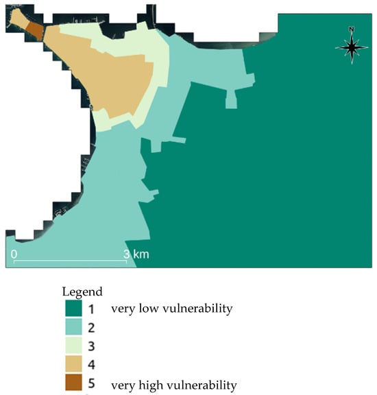 This classification allows for a consistent comparison of spatial patterns, simplifies cartographic representation, and enables the identification of priority areas for mitigation actions, such as the targeted implementation of nature-based solutions (NBSs). The chosen thresholds are empirically defined and reflect increasing levels of environmental pressure and exposure as determined by the multi-criteria vulnerability model.