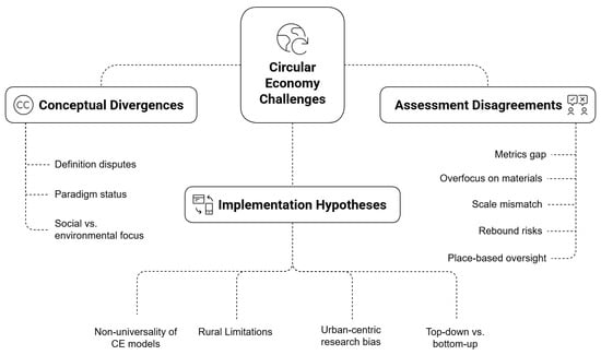 Finally, there are significant disagreements on assessment and indicators to measure and monitor the CE transition effectively. One key issue is the metrics gap, where scholars point out that robust, consistent indicators for assessing CE, particularly at local or municipal levels, are lacking [13,27,29]. Many existing frameworks remain theoretical due to data unavailability or incompatibility with local governance structures [20,27,32]. Closely related is the overfocus on materials. Current assessments prioritize material flow analysis, waste management rates, and carbon emissions, but overlook less tangible but equally important factors like social participation, institutional readiness, and governance capacity [20,27,29,33,44]. This narrow scope contributes to a scale mismatch, where national-level indices cannot be meaningfully transferred to subnational levels due to missing localized data or unrepresentative indicators [33]. Another controversial area involves rebound risks, where increasing circularity may unintentionally cause environmental harm, such as through heightened energy use or shifts in consumption that negate material savings [20,33,45,46]. Finally, scholars highlight a persistent place-based oversight in CE measurement frameworks [27]. These often fail to consider spatial characteristics, such as land use or urban form, which influence the feasibility and impact of CE actions [47,48]. Ignoring these contextual factors reduces the practical relevance of CE assessments for regional and municipal decision-makers [49,50,51].