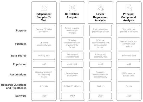 To address the research questions and test the proposed hypotheses, this study employed a quantitative research design combining survey-based CE index scores with secondary statistical indicators. A series of statistical methods was applied to examine differences, associations, and predictive patterns across municipalities. The overall research methodology is presented in Figure 2.