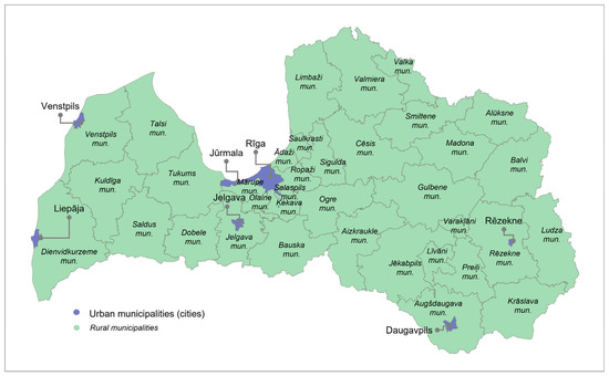 The last reform of the administrative territory in Latvia was concluded in 2021. As a result of this reform, Latvia is split into seven state city governments and 36 municipality governments [82]. The geographical distribution of this population (n = 43) is shown in Figure 3.