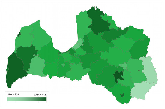 During the previous research project [52], CE index values were established across all 43 municipalities in Latvia and are visualized in Figure 4.