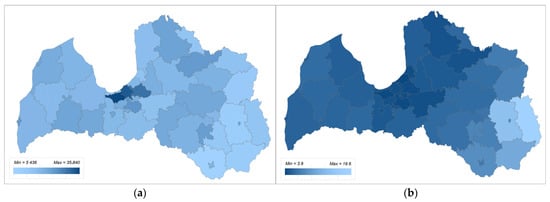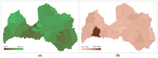 In the urban municipalities, the population density (on average, 1240 people/km2) is significantly higher than in the rural areas (on average, 31 people/km2). However, the distribution of the generated municipal waste does not visually correlate with the population density in urban areas. The national average of 1.57 t of generated municipal waste in 2023 significantly exceeds the EU average of 0.51 t per person [89]. For the waste indicator, one rural municipality (Ropažu novads) has almost 10 times the amount of waste as the country’s average. This indicates a data allocation issue, as the largest landfill is located in this municipality.