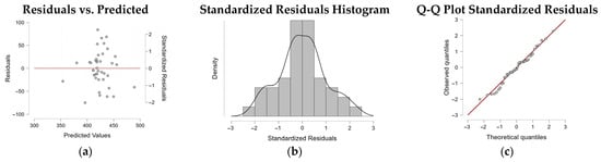 - Linear regression analysis (n = 40): to explore which variables significantly predict CE index values when controlling others and to estimate the overall explanatory power of the model (RQ3, H4) [55]. Assumptions regarding normality, homoscedasticity, multicollinearity, and independence of residuals were checked. The Durbin–Watson statistic was used to detect potential autocorrelation, which was minor but statistically significant and noted in the respective results sub-section.