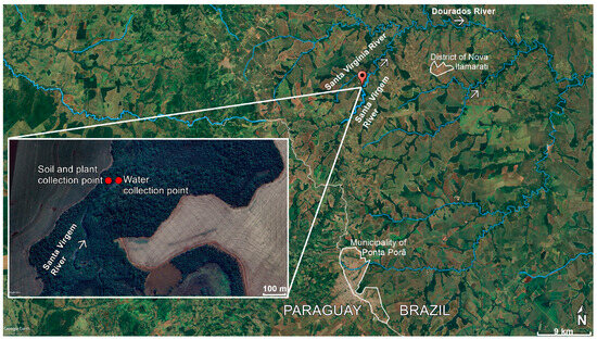 The Santa Virgem River extends for 23.5 km and is located 18 km from the district of Nova Itamarati, which currently has 17,000 inhabitants [35]. This district, which belongs to the municipality of Ponta Porã, state of Mato Grosso do Sul (MS), is located on the border between Brazil and Paraguay. The Santa Virgem River is a tributary of the right bank of the Santa Virgínia River; it forms the border between the municipalities of Antônio João and Ponta Porã, Paraná River basin, Brazil [36]. The region where the Santa Virgem River is located is characterized by rivers and streams that play a fundamental role in territorial delimitation and local water supply (Figure 1).