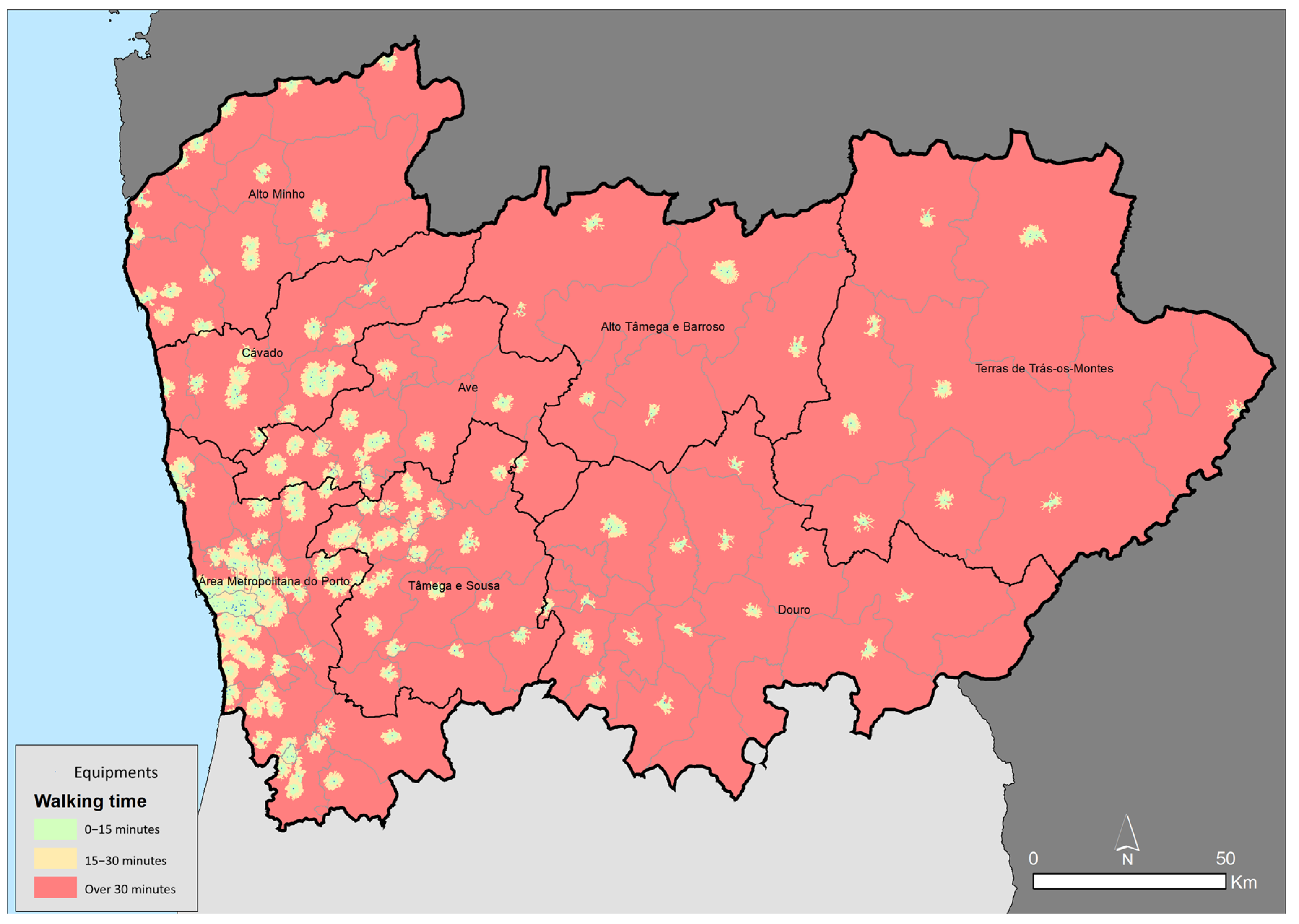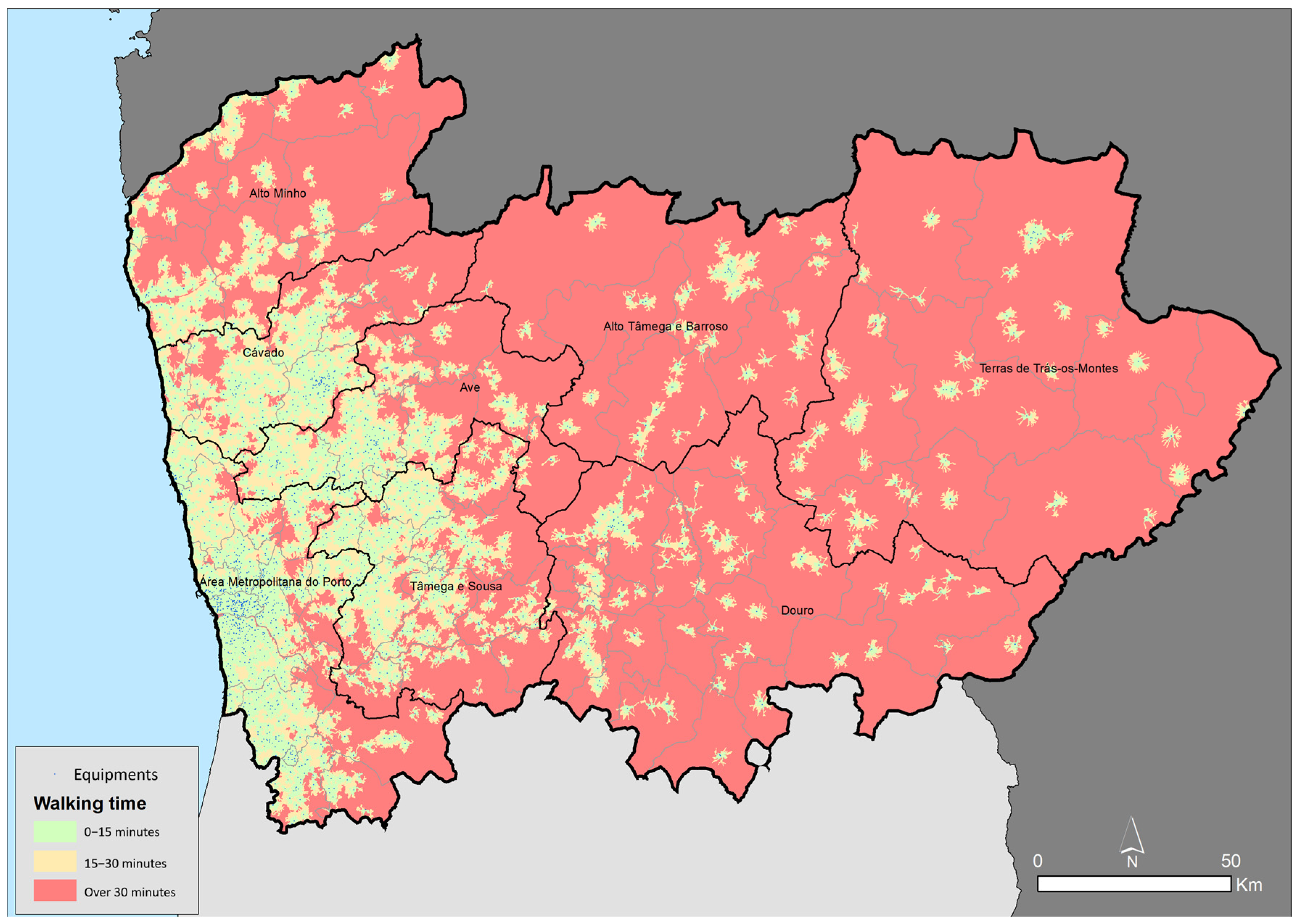 RQ2: How do spatial disparities in accessibility to essential services shape the practical feasibility of the “15-minute city” model in Northern Portugal?