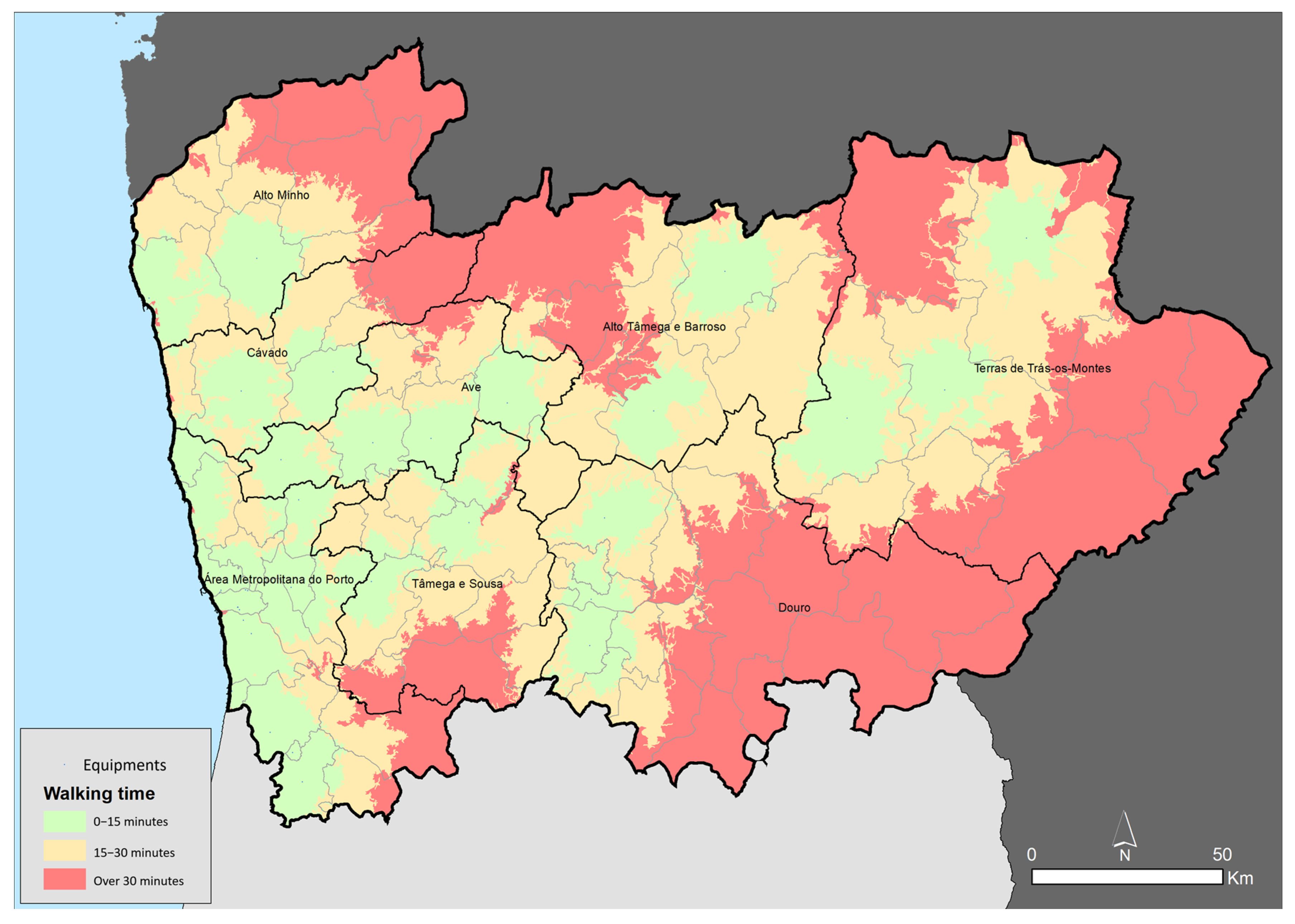 The implementation of the 15-minute city model across different territorial contexts in northern Portugal is marked by significant heterogeneity. While the model advocates for spatial justice and quality of life through the proximity of essential services, its real-world application reveals notable asymmetries across the eight NUTS III regions of the north.