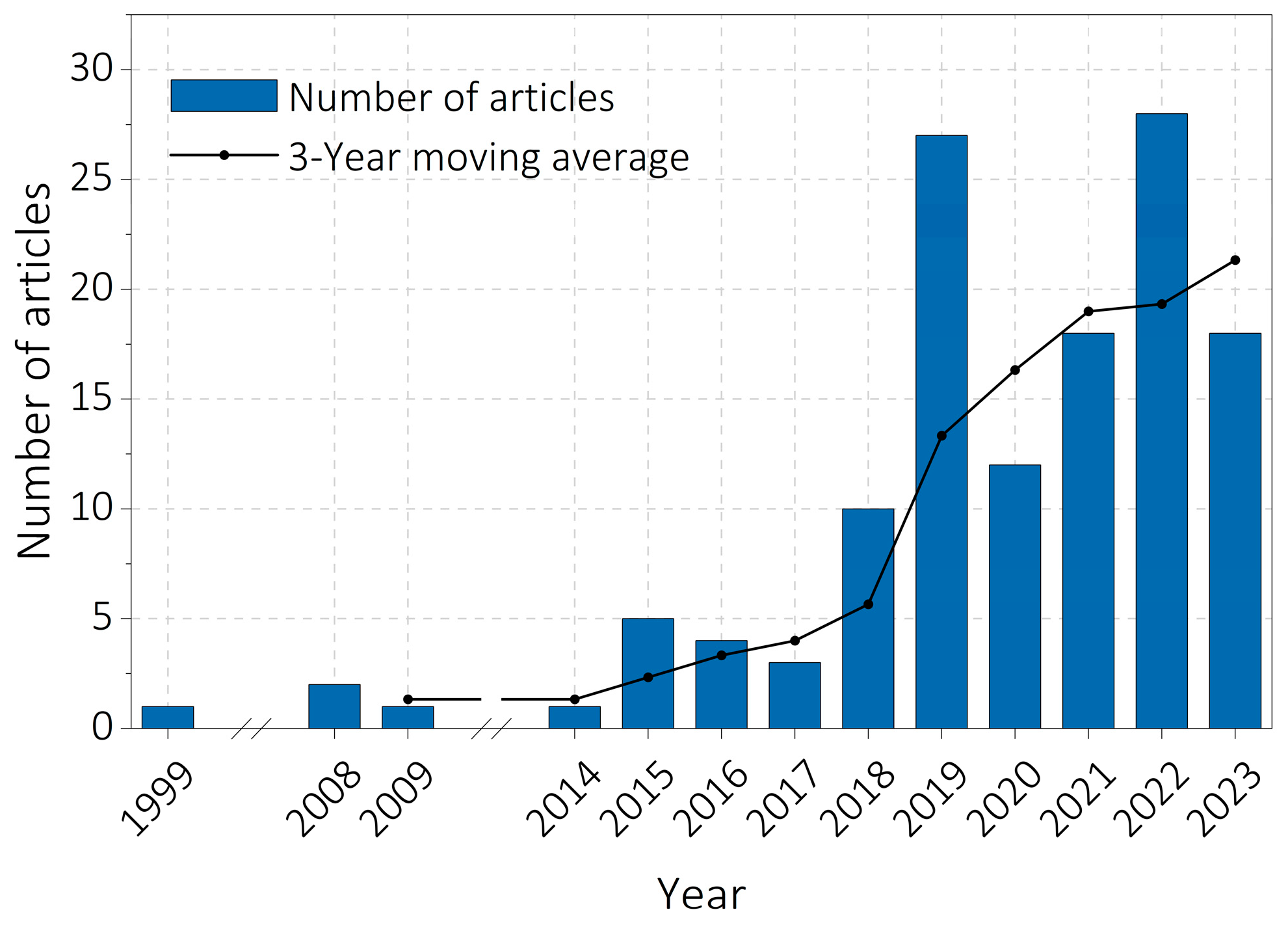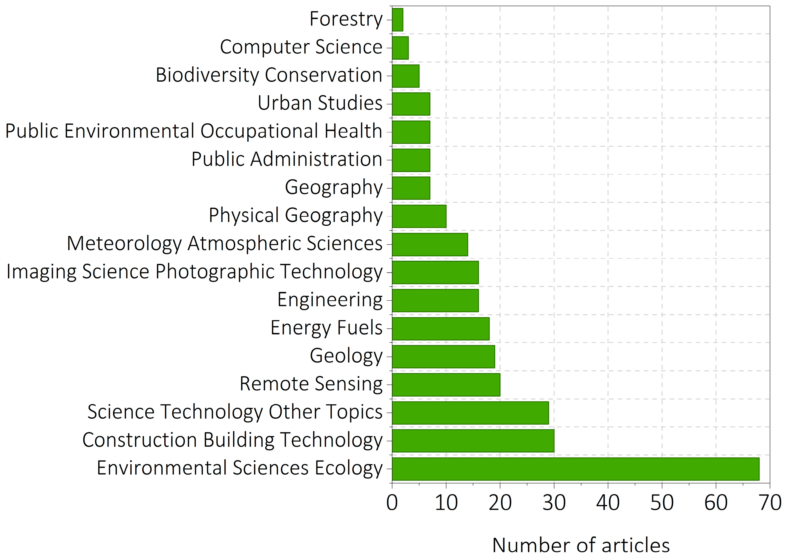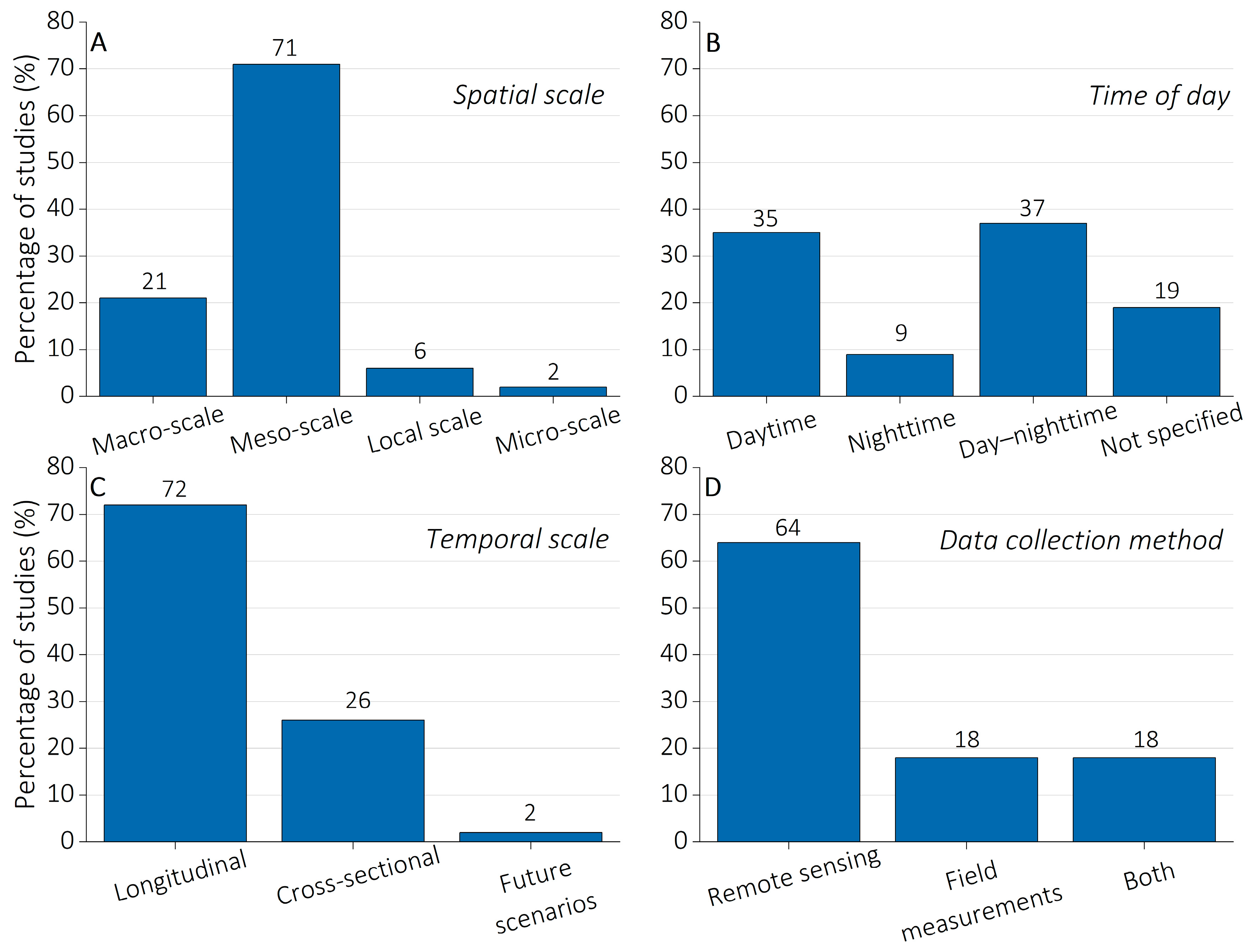 In terms of spatial scale, meso-scale studies (91 articles) were the most common, analysing built-up areas or entire cities with their surroundings. Macro-scale studies (28) compared cities or regions, while local-scale studies (8) focused on neighbourhoods or city blocks. Micro-scale studies (3) analysed individual urban elements such as roofs, walls, building units, streets, or urban canyons.