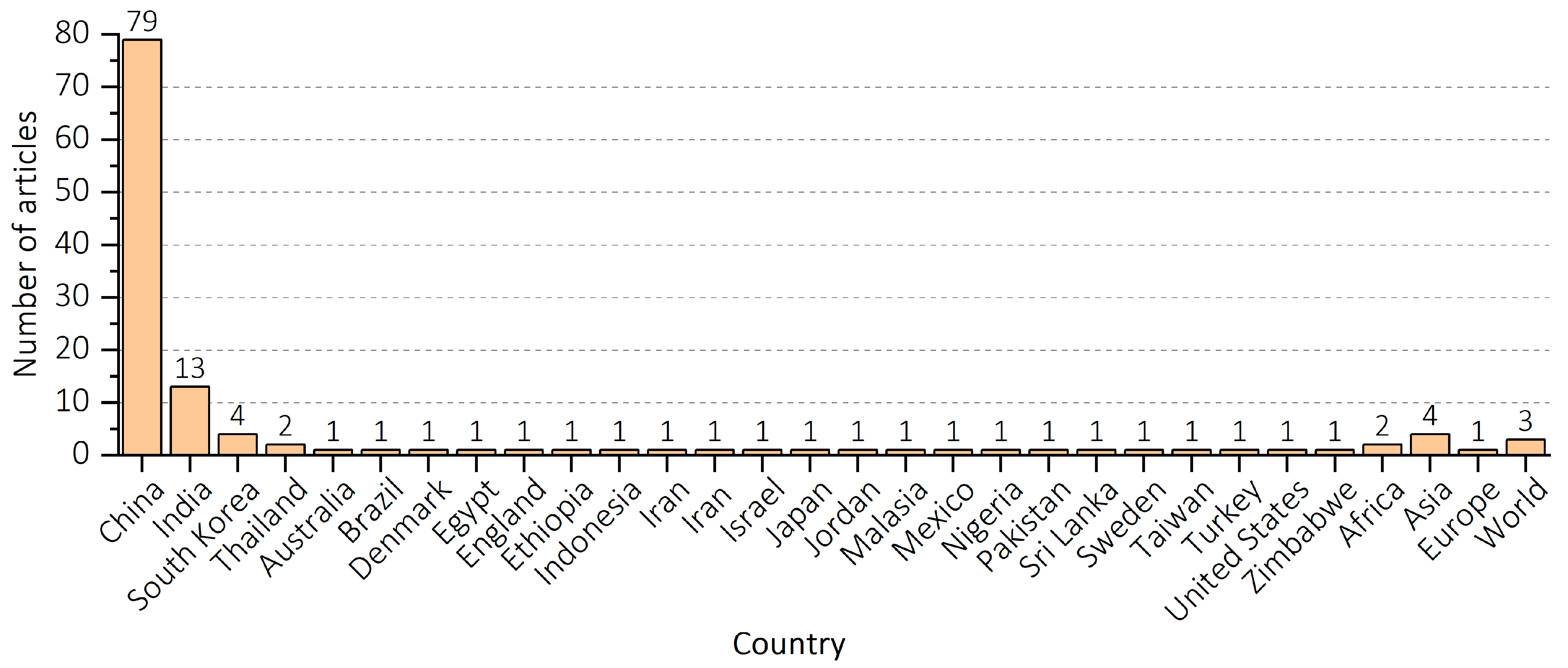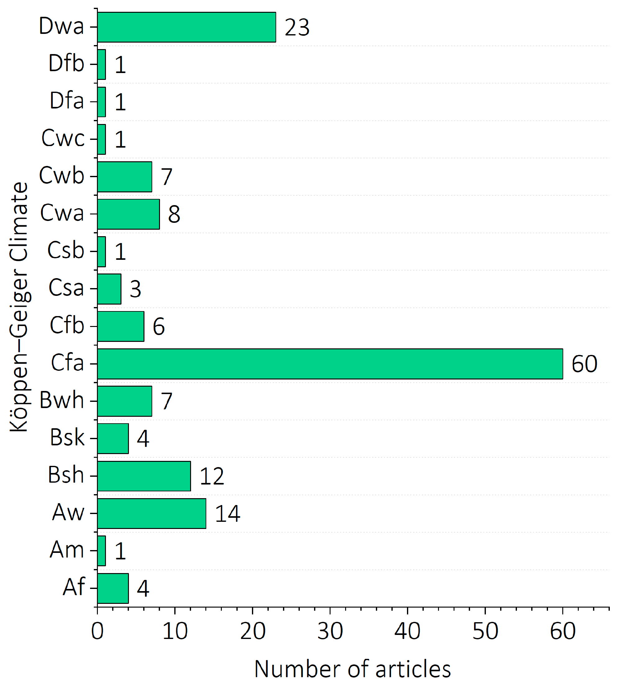 Most studies examined Cfa climates (60 articles), primarily in China, followed by Dwa (23), mainly in China and South Korea. Aw (14) was the third most studied climate type, with research concentrated in India and Thailand.