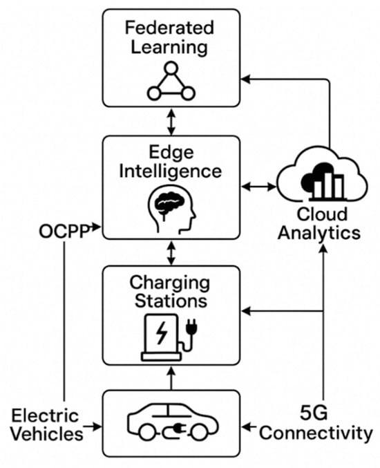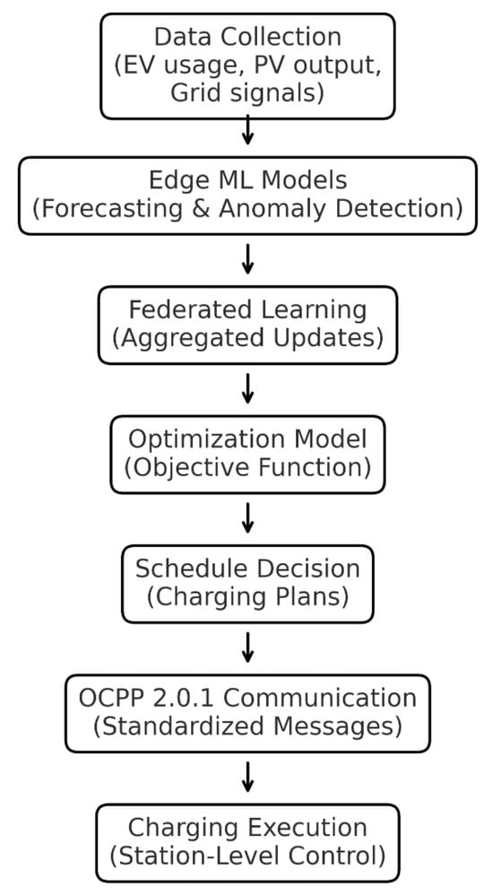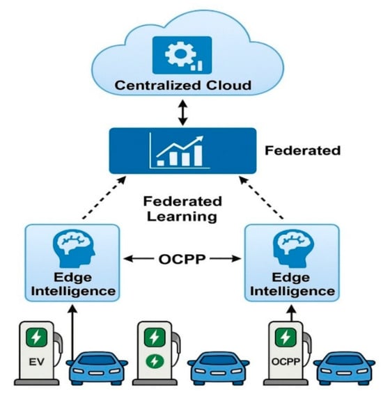 Figure 1 illustrates the high-level architecture of the proposed AI-driven EV charging framework that integrates with the Open Charge Point Protocol (OCPP). The framework leverages edge intelligence units deployed at individual EV charging stations to enable local decision-making and real-time data processing. These units communicate using OCPP standards and are supported by a federated learning mechanism that allows collaborative model training without sharing raw data. A centralized cloud coordinates the global analytics, aggregating the locally trained models to optimize system-wide performance while preserving data privacy []. This architecture enhances scalability, security, and interoperability in smart EV charging networks.