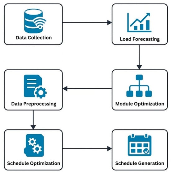 Figure 2 illustrates the step-by-step process of the predictive scheduling algorithm used in smart EV charging systems. It begins with data collection from charging stations, followed by data preprocessing and load forecasting. The forecasted data is then used in module optimization, leading to the optimization of charging schedules. The final output is a dynamically generated charging schedule that improves efficiency, reduces peak demand, and ensures adaptive energy distribution across the network.
