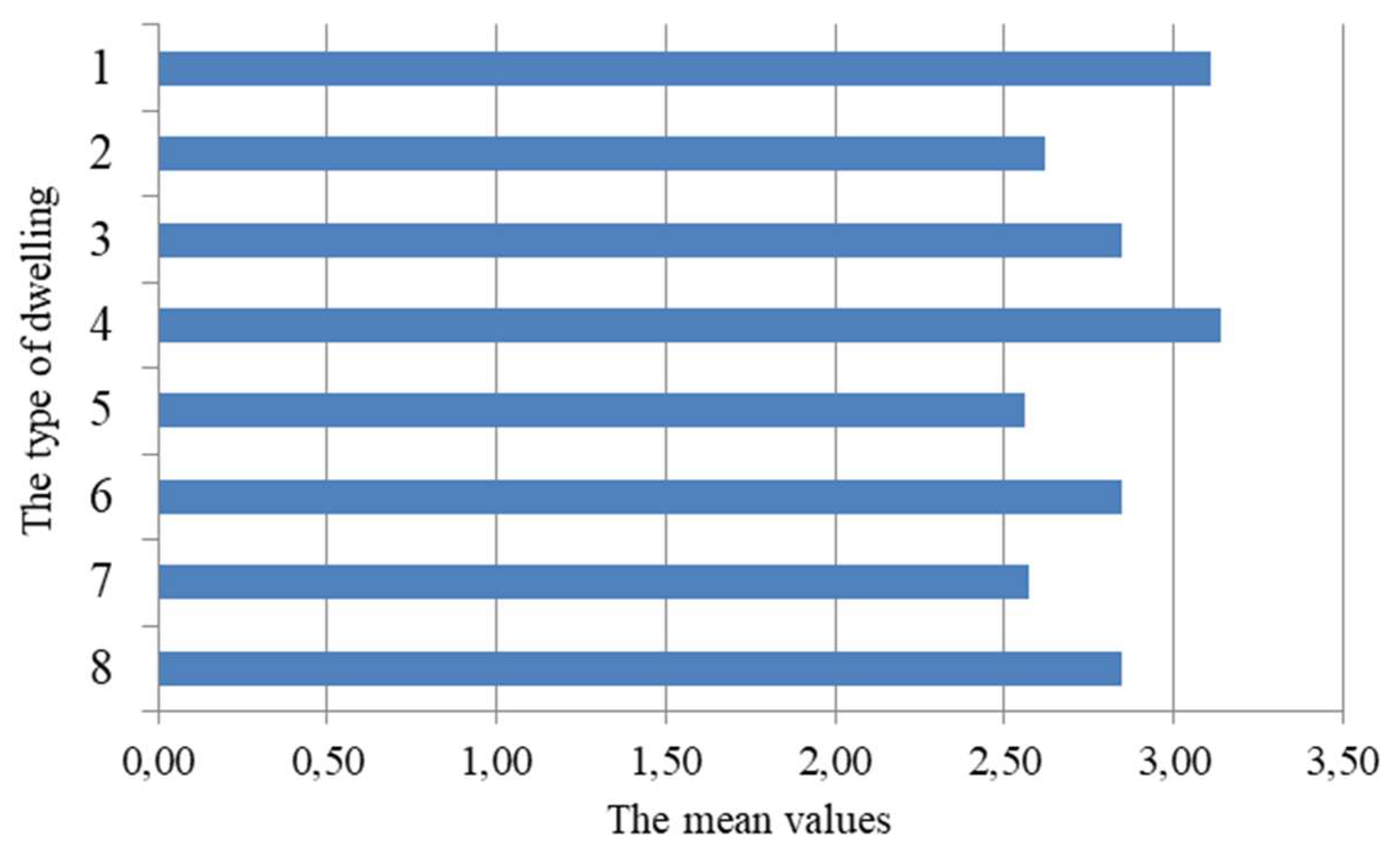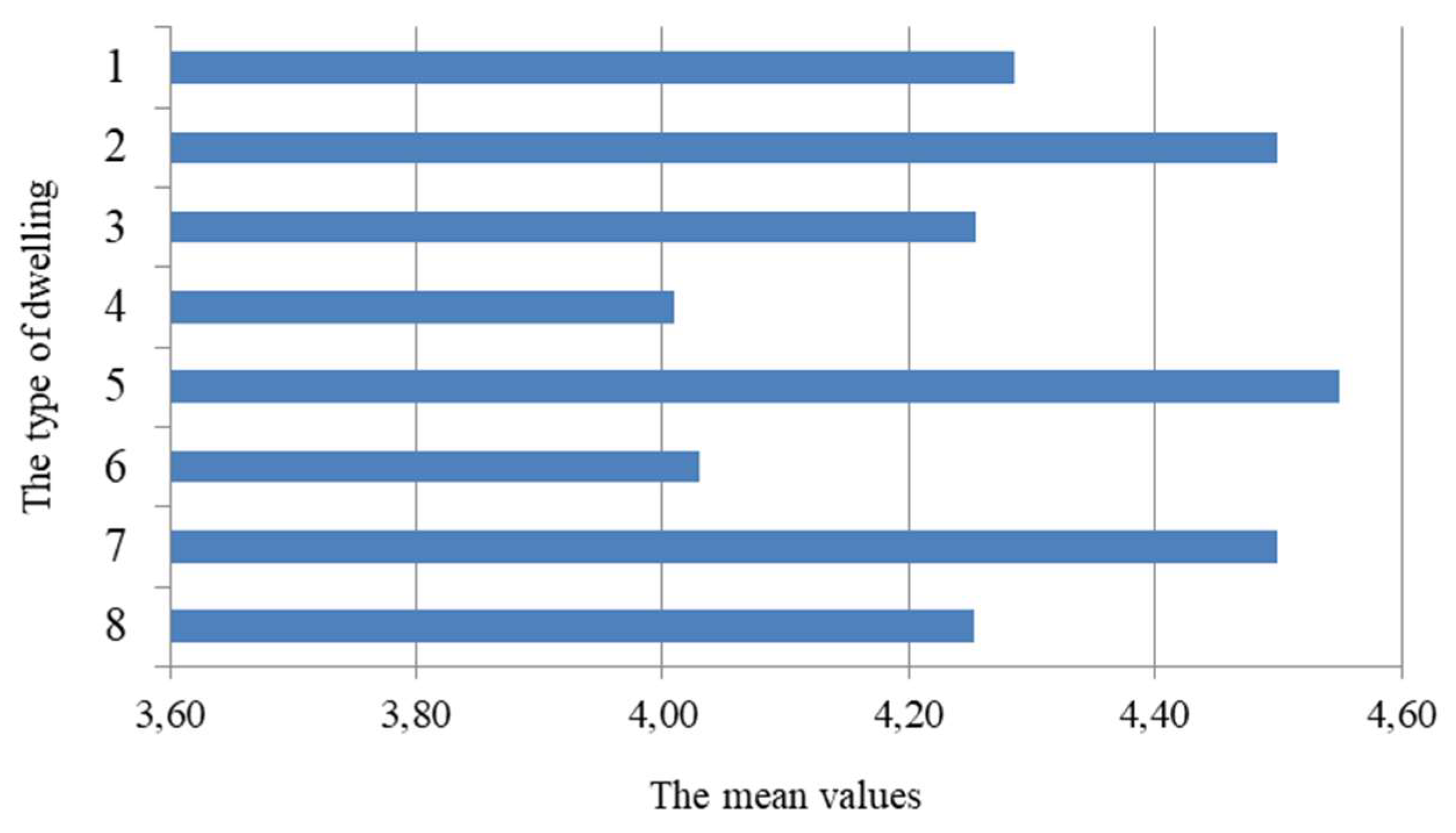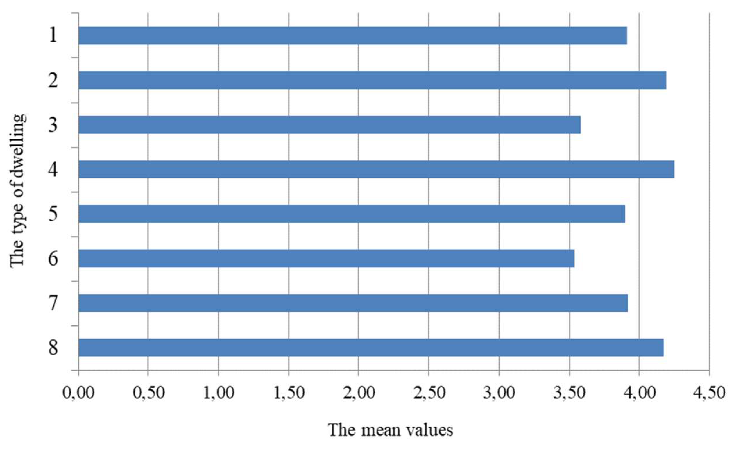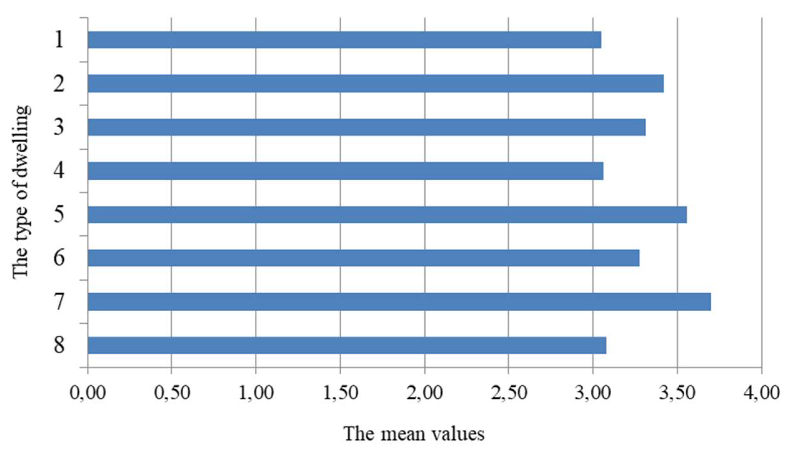 It should be noted that the paired comparisons conducted using the Mann–Whitney U-test did not reveal statistically significant differences in the values of the parameter among residents of “Leningradka” and “Contemporary design dwellings” (U = 359,500, p = 0.420). In other cases, however, the differences were statistically significant (U = 174,000–221,500, p < 0.005).
