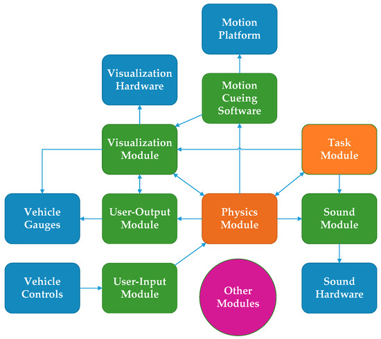 Other modules could be added to include Artificial Intelligence or provide other perceptual multimodal cues, such as tactile, haptic, olfactory, thermal, pressure, etc. In this regard, it is important to clarify that the proposed structure represents one possible general approach for organizing a vehicle simulator. This could be adapted to fulfil the particular requirements of the simulator, and other approaches can be proposed where some components may be absent or some others may be needed.
