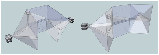 - Six projectors and three white flat reflective surfaces (two projectors per surface) with the same size as in setup #2. The use of three screens allows the creation of different visual setups (U-shaped or trapezium-shaped) that are much more immersive than the one in setup #1 (see Figure 6).