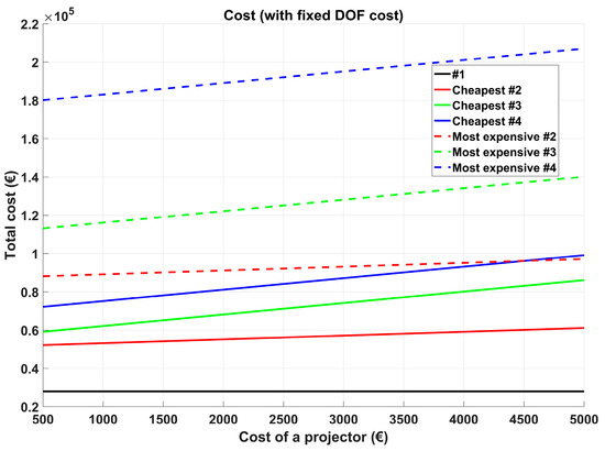 The total cost figures are shown in Table 2, Table 3 and Table 4 for setups #2, #3, and #4, respectively. They are calculated applying Equations (3–5) with the values of Table 1. The cost of setup #1 is calculated with (2) and it is 27,900 €. Figure 10 and Figure 11 also represent the cost of the different setups, varying and in the range depicted in the first and last columns and rows of Table 2, Table 3 and Table 4. They represent the cheapest and most expensive configurations, varying with respect to the cost of and .