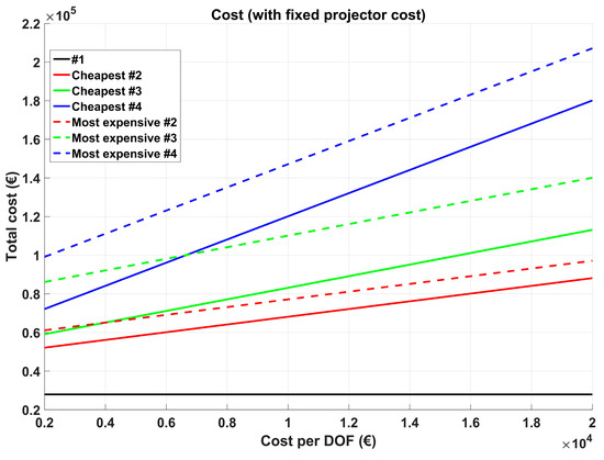 The total costs vary from 27,900 to 207,100 €, which is a very wide range. Most of this variation is caused by the wide range of prices and features of motion platforms. Figure 11 is probably the most interesting one, since the cost of projectors have smaller variations than motion platforms.