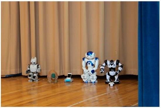 - Jeon, M.; FakhrHosseini, M.; Barnes, J.; Duford, Z.; Zhang, R.; Ryan, J.; Vasey, E. Making live theatre with multiple robots as actors bringing robots to rural schools to promote STEAM education for underserved students. In Proceedings of the 11th ACM/IEEE International Conference on Human-Robot Interaction (HRI’16), Christchurch, New Zealand, 8–10 March 2016; pp. 445–446. [Google Scholar]