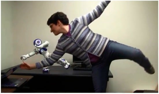 Dance involves visual, auditory, and tactile modalities and it is familiar and fun to most people. Because of these characteristics, researchers envisioned that dance can be used for pedagogical and therapeutic purposes, with a range of disorders from autism spectrum disorders (ASD) to schizophrenia. Indeed, the recent research attempts to use dancing robots for children with ASD. An ongoing research study (Figure 3) attempts to use a “dance freeze” game to facilitate social interactions of autistic children [42].