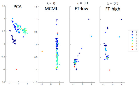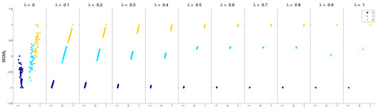 The two parts of this new matrix are then weighted using the parameter defined in Equation (5), where corresponds to the original matrix and leaves the extended part only. Finally, embeddings can be computed with a DR technique. Figure 1 shows the resulting projections with a series of values using a supervised DR technique MCML (as discussed in Section 2).
