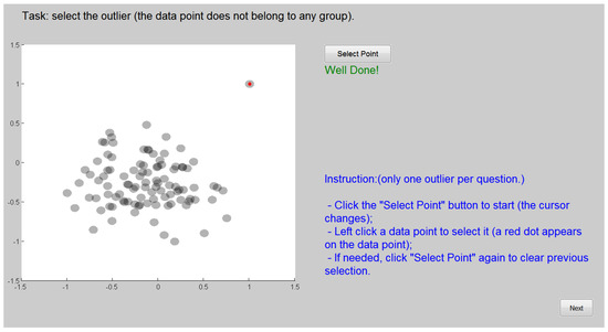 - Outlier: Similarly, this task requires participants to identify visually an outlier within the original dataset, which is another important property of high-dimensional data. To simplify the accuracy measurement, each dataset has exactly one outlier, so the answer can be either correct or incorrect. This avoids the case of ‘partially correct’ answers when there are two or more outliers.