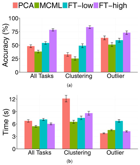 - Clustering is a more difficult task than outlier identification. Its accuracy is significantly lower and took significantly longer to complete. Except for FT-high, all techniques led to accuracy of only around 25%. This demonstrates that it is almost impossible to perform visual clustering analysis without feature transformation.