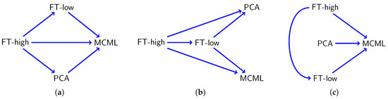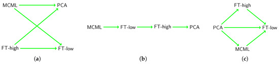 Figure 4a shows the mean accuracy. A RM-ANOVA test showed a significant main effect of method (), task (), and the interaction method × task (). Follow-up paired t-tests with Holm correction revealed that FT-high was significantly more accurate than FT-low (), and both FT-low () and PCA () were significantly more accurate than MCML. FT-low () was more accurate than PCA (), but the difference was insignificant (). The results are summarised in Figure 5a, where each line indicates a significant difference, pointing towards the less accurate condition.