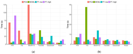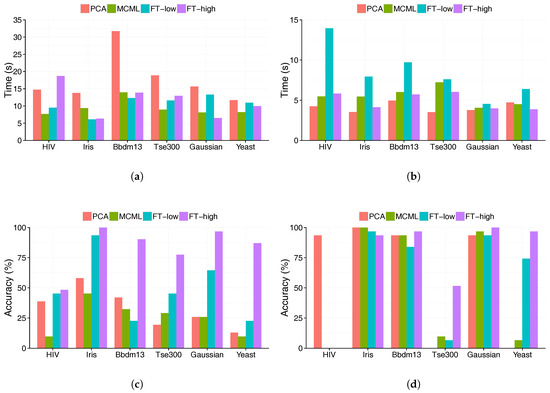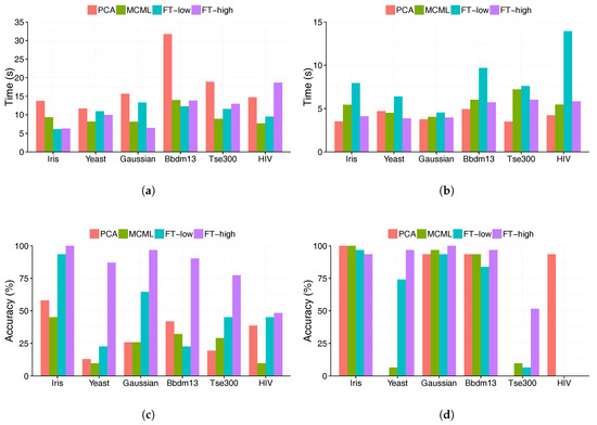 Figure 8 shows the same results as in Figure 7a–d, but ordered by the data set dimensionality, increasing from left to right. There is a weak trend of increasing completion time with the data dimensionality (Figure 8a,b), which is an indicator of the data set complexity. The trend is less clear for the accuracy results (Figure 8c,d), possibly because the suitability of the visualisation method is the main factor. For example, PCA led to low accuracy with the Yeast and Tse300 dataset, and performed very well with the result of data sets (Figure 8d).