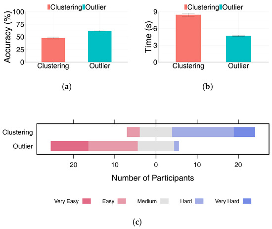 Clustering vs. outlier task. (a) Task accuracy (higher is better); (b) Task completion time (lower is better); (c) User preference.