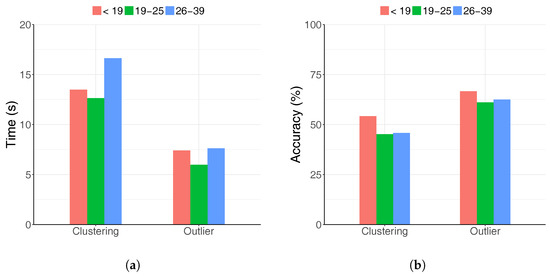 Performance in different age groups and tasks. (a) Completion time; (b) Accuracy.