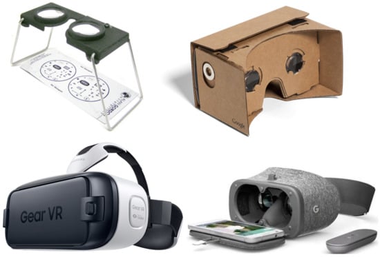 A portable pocket stereoscope [], a low-cost Google Cardboard [], a Samsung Gear VR [], and a premium Google Day Dream [].