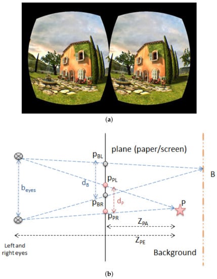 Figure 2b demonstrates the background theory of stereo vision that makes VR work. Shown in the figures are two points: B is a point virtually lying on the background, and P is a point lying in front of the background (they may look different in shape or colour). Human eyes have a base distance . These two points are projected on to the screen at different points: and for B, and and for P. Many 3D points will appear in our brain when the eyes see a set of two projected correspondence points. Theoretically, the distance between two correspondence points , will determine how close/far the point is, in space: