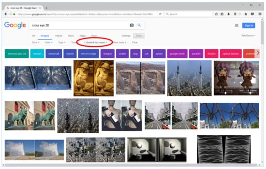 Figure 3 displays the results of a quick Google Search on keyword: “cross eye 3D”. Notice that the search engine is set to find only images labeled for reuse; in other words, these images can be used for any purpose, and in any area, without being modified. Even more, Google also provide categories of the images for the users, as seen in the figure, some of the categories are: “woman”, “minecraft”, “skyrim”, “dragon”, “snake”, “dog”, “cat”, “spider”.