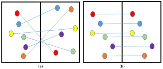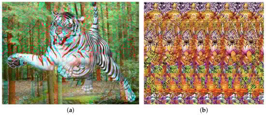 Another special type of stereoscopic image is the single-image stereogram or autostereogram (as shown in Figure 4b). Tyler et al. first introduced the autostereogram in 1990 [] and quickly gained significant interest from the public. Tyler managed to demonstrate the ability to generate depth illusions by using image patterns consisting of many random dots. The entire image is achieved by encoding three-dimensional images into distortions of symmetrical patterns which can then be decoded by misleading the eye convergences. In particular, viewers can focus on a point in front of or behind the image surface. The repeating patterns will thus be moved sideways, and the brain attempts to fuse them together by focusing on certain pairs at different parallax angles. The image patterns, thus, appear to float at different depths correspondingly.
