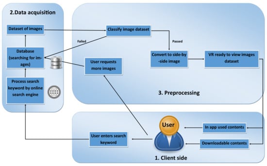 We propose a system for users to retrieve automatically aligned stereo left and right photos from different categories. The system combines human-computer interaction as well as with local and global systems collaboration. The system is divided into three main modules as shown in Figure 5. They are Client Side, Data Acquisition and Preprocessing.