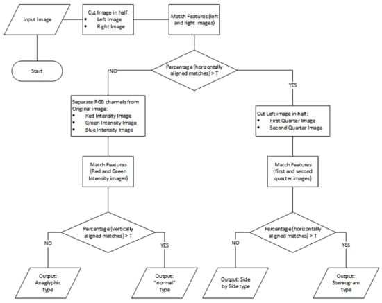 For side by side pictures; there is a strong correlation between two halves of the pictures; however, there should not be many matched points between the two-quarters of the picture. On the other hand, a strong correlation is still maintained in two-quarters of the Stereogram image. Such information could be used to identify Stereogram and Side by Side images. Lastly, we can use to separate between “Normal” and Anaglyphic images. Here, we only look at red and green channels of an image. From which, we propose a process to identify these type from an arbitrary image on the Internet base on thresholding the values of and . The process is simplified in Flowchart displayed in Figure 9.