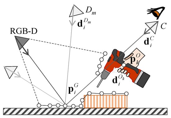 Given calibrated multi-viewpoint cameras surrounding the working environment (Section 3.2), our goal is to remove a tool held in the worker’s hand in the worker’s view C, as shown in Figure 1. Figure 2 shows our proposed pipeline. To achieve this, we redesign the camera blending fields (CBFs) of Buehler et al.’s ULR [], which is a generalized form of free-viewpoint image generation method that uses unstructured cameras. Our DR system first captures multiple color images and a depth image and starts calculating CBF (Section 3.3), surface extraction (Section 3.4), region of interest detection (Section 3.5), and finally view synthesis (Section 3.6). The following sections describe the redesigned CBF to view synthesis using the CBF for DR rendering.
