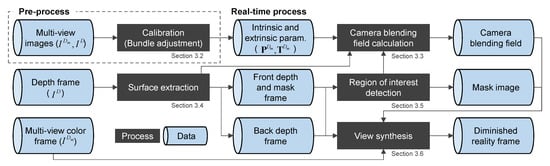 In contrast to the methods introduced thus far, the proposed method sequentially updates the background resources of video streams with several multi-view cameras surrounding the environment. The most relevant approach in terms of the rendering framework is a method proposed by Cosco et al. [], who removed a visually obstructive haptic device using their visuo-haptic system. Assuming the background was static, they manually created scene polygons and captured the scene from various viewpoints before placing the haptic device. They used the images as inputs for a simplified unstructured lumigraph rendering (ULR) [] to recover the currently hidden area. We instead use a rangefinder and multiple color sensors to obtain the background’s geometric and appearance changes, respectively, in an automatic manner. We also need to factor in objects to be removed that appear in the background resources, which do not appear in Cosco et al.’s pre-captured background images.