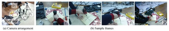 In all experiments, we used a Microsoft Kinect sensor and three USB cameras (640 × 480 resolution) to record frames showing non-planar work areas; and are both set to 1.0. We used an electric drill/screw as a hand-held device to be diminished. The proposed system was implemented on a Windows 10 64-bit laptop with an Intel Core i7-6567U 3.30 GHz CPU, Intel Iris Graphics 550 GPU, and 16.0 GB memory. The CBF calculation (Section 3.3) and view synthesis based on the CBF (Section 3.6) was implemented on CPU and GPU, respectively. The system was implemented using C++ and OpenGL shading language 3.3.