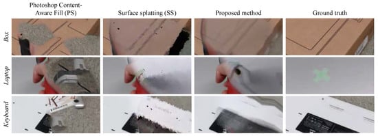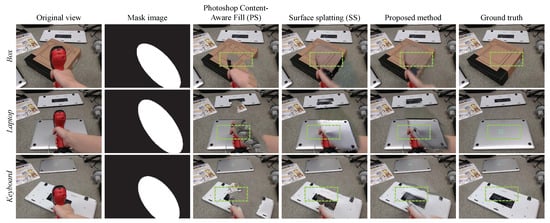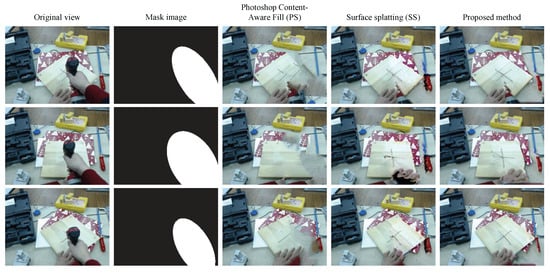We present video results of the proposed method (A supplemental video is presented) and conventional DR methods for visual comparison in a DR scenario to show that our method works in real-time to remove an object of interest in a dynamic scene. Here, we discuss image quality of each DR method. Figure 3 shows our setup in this experiment. For comparison, we selected Photoshop Content-Aware Fill and surface splatting [] as the inpainting and geometry-based approaches, respectively. To apply the inpainting to the videos, we created mask frames in a manner described in Section 3.5 and filled in the ROI with the inpainted results. We used this mask sequence for the other two methods. For surface splatting, we used the Kinect sensor and a USB camera of the worker’s perspective. That is, the Kinect point clouds were transformed to the worker’s view and rendered as surfels [] in the ROI. We hereby refer to the frame-by-frame Photoshop Content-Aware Fill and the surface splatting to PS and SS, respectively.