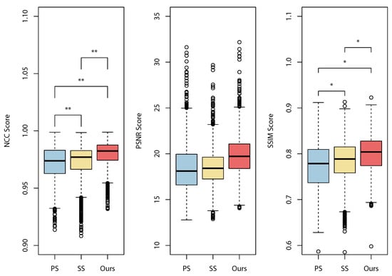 Statistical DR results of the NCC, PSNR, and SSIM evaluations. Remark: (significance: (**) p < 0.01 and (*) p < 0.05).