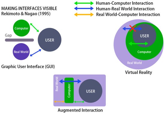 An approach of styles of interaction and interfaces, by Rekimoto and Nagao in the 90s [92]. They propose, in an early phase of the theoretical approach to interaction with virtual reality, a conceptual approach comprising the user, the computer (defined not as interface but as digital or artificial information) and the real world. Even though approaches in interfaces for VR and immersive environments have evolved, the conceptual models developed later include, as basic components, the relationship between user, information and environment, being useful for developing virtual reality experiences.