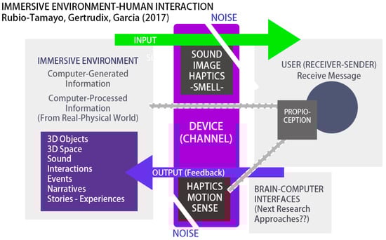 In recent years, definitions and differences between the ideas of VR and immersive environments have focused on relevant studies such as those of North and North [28], arguing that user experiences “are critical components” in developing more immersive applications. Cummings and Bailenson [29] examine the effect of technological immersion on the factor of presence, concluding “that increased levels of user-tracking, the use of stereoscopic visuals, and wider fields of view of visual displays are significantly more impactful than improvements to most other immersive system features”. However, Communication Theory sets out an interesting basis for going in depth into factors related with interaction with virtual reality and immersion in artificial environments. In this manuscript, we present an approach based on inputs and outputs between users and immersive environments, and different ways in which interaction-communication may be defined.