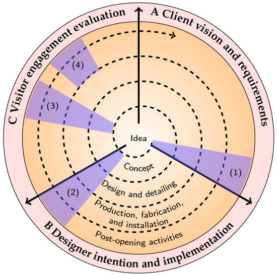 Each of the four phases consists of three stages: (A) the client vision representing the functional and non-functional requirements set by the museum or science centre; (B) the designer intention representing the creative processes; and (C) the visitor experience, represented by a visitor-centric assessment and evaluation process.