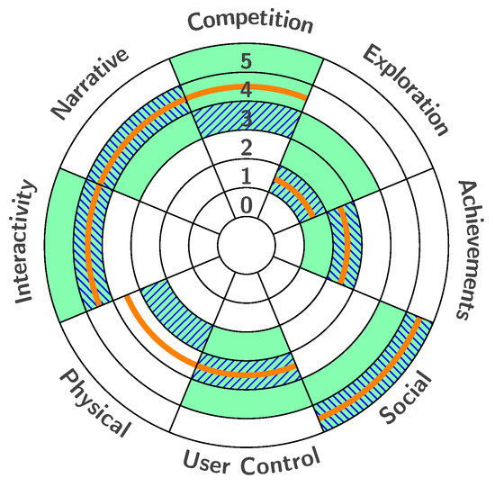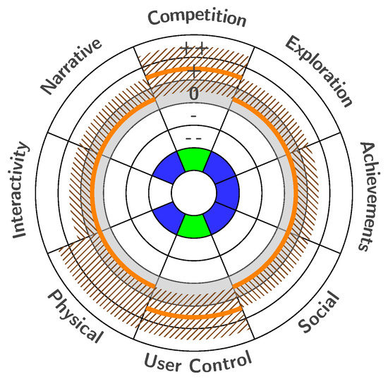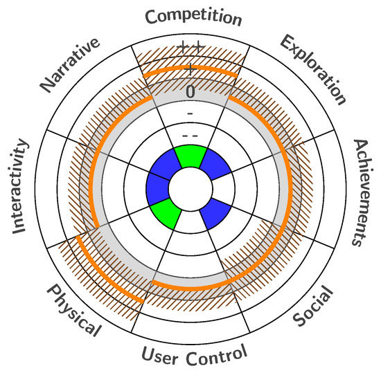 In each of these stages, dedicated evaluation activities are performed, as indicated with the respective numbers in the blue areas in Figure 1: (1) At the end of Stage A (client vision and requirements), the client vision (i.e., the value ranges of the engagement profile the curators assume best suited) is drawn into the design diagram, represented as the green areas in the example in Figure 2. (2) At the end of Stage B (designer intention and implementation), the designer intention (i.e., an evaluation of the designed artefact) is added, represented as the fields with blue hatches. (3) In Stage C (visitor engagement evaluation), the visitor experience (i.e., the visitors’ opinion about the artefact) is added, represented as the orange lines. (4) In Stage C, a practical evaluation can be performed when this is viable, using sensors, surveys, and observations as presented by Leister et al. [1].