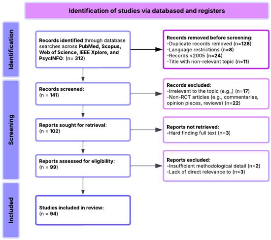 This left 94 studies eligible for detailed review and extraction, which were manually validated for inclusion. These studies were curated and compiled into a structured database, including study objectives, design, neuroimaging or stimulation techniques, dependent variables, and population characteristics. The included studies underwent qualitative synthesis based on their relevance to the research questions on neuroplasticity-informed learning under cognitive load, functional imaging and brain stimulation findings, and educational technology applications.