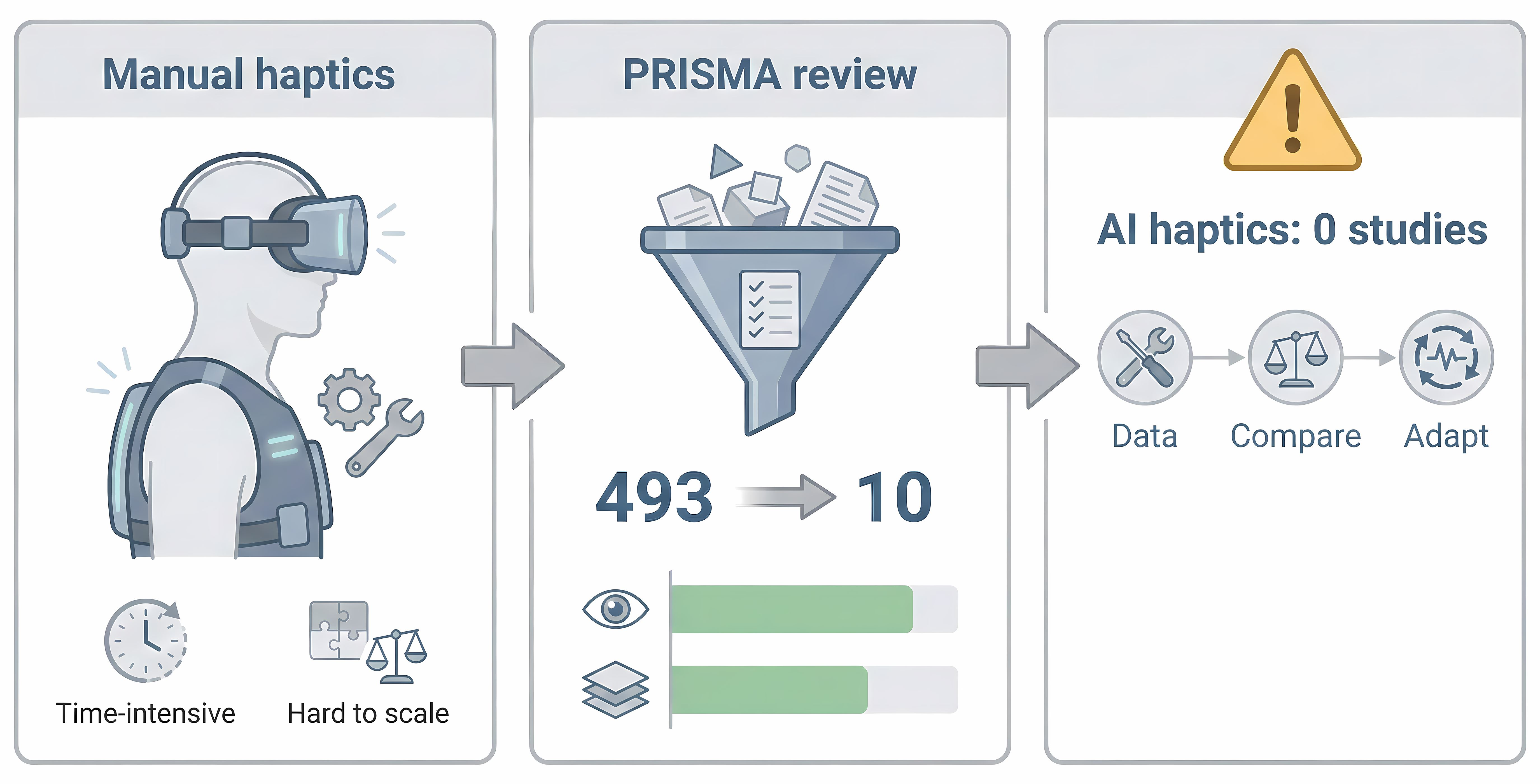 - What this review adds: (I) First PRISMA-style synthesis of user-evaluated haptics in narrative VR, spanning 10 studies and consolidating what reliably improves presence/immersion/affect. (II) An empirical baseline table (Table 1) that unifies design, hardware, synchronization, measures, and quantitative effects usable as a benchmark for future AI systems. (III) Gap formalization: 0/10 studies evaluate AI-procedural haptics with human participants in narrative VR, and 0/10 use validated narrative-comprehension instruments. (IV) An actionable roadmap with experimental design details (non-inferiority margins, authoring-time accounting, latency budgets) to move the field from theory to evidence.