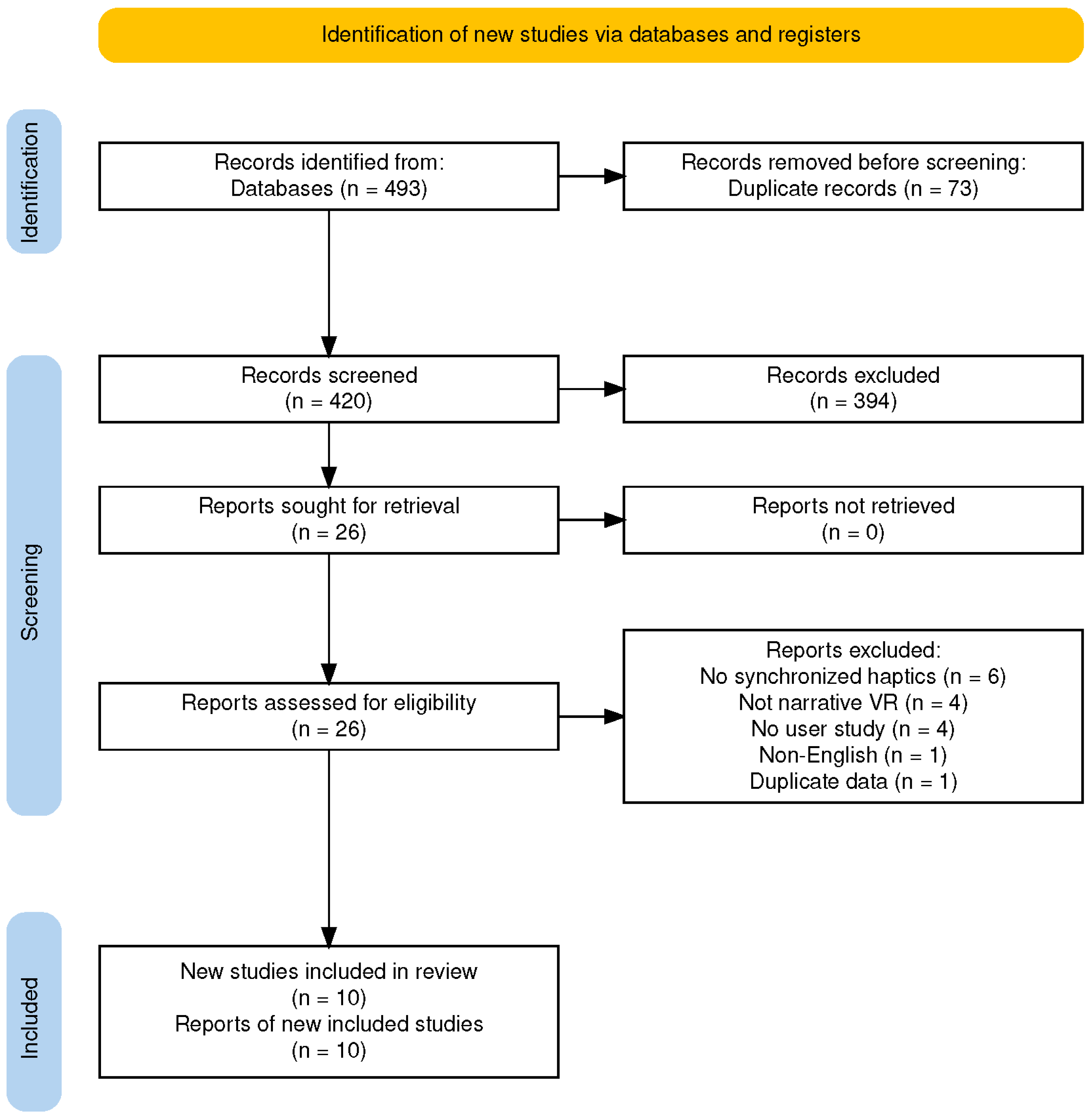 - Screening & extraction: One reviewer screened records and extracted the title, venue/source, year, AI approach, haptic method, VR-narrative relevance, presence of user study (Y/N), and basic device/placement/synchronization details. A second reviewer verified entries.