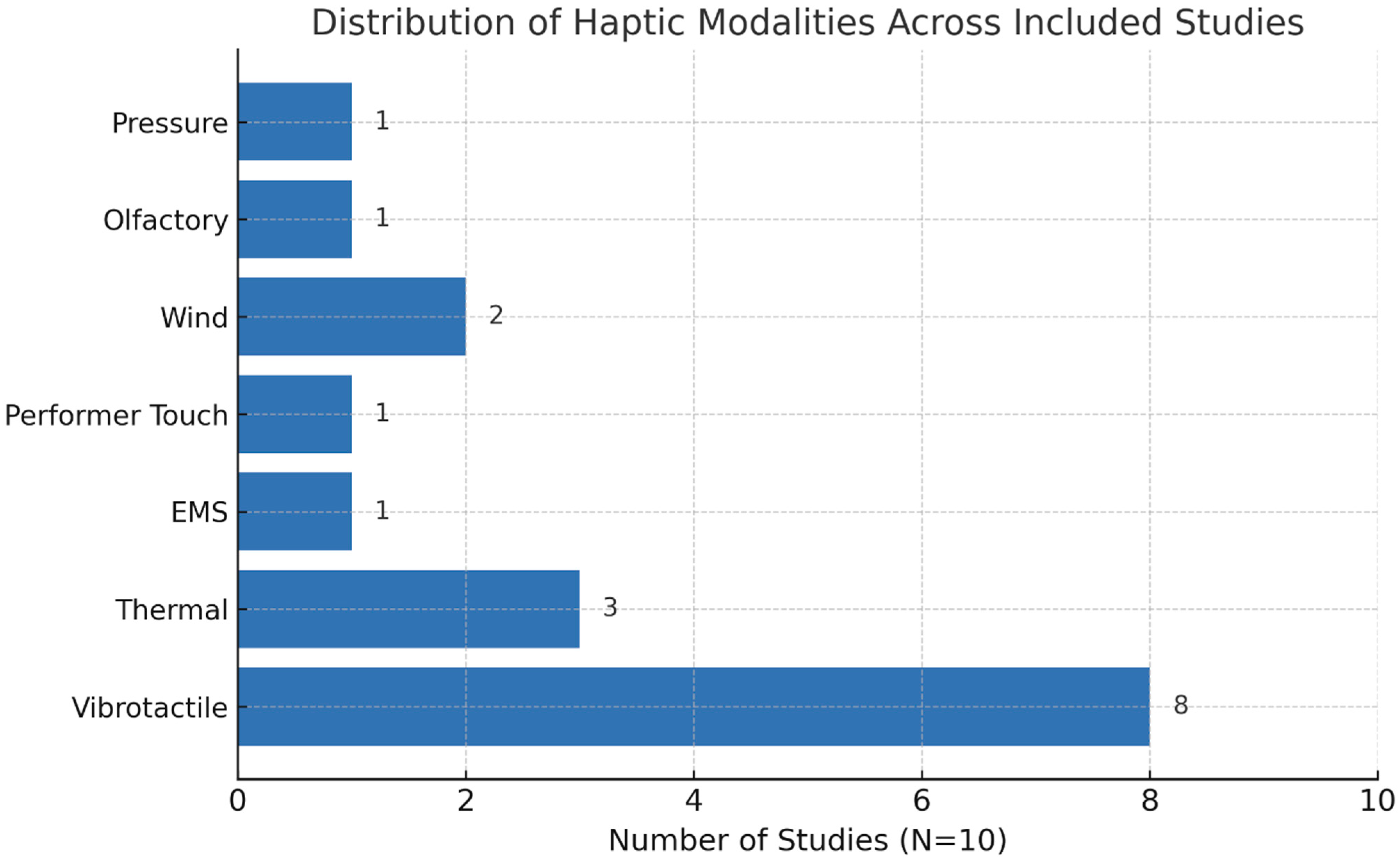 - Hardware and Modality: Furthermore, properties of the hardware and modality themselves naturally modulate the user experience. The diversity of modalities presented in this review—from wearable vests to EMS electrodes to non-wearable fans and vibration platforms—is symptomatic of the diversity of existing wearable haptic systems [7]. No one modality, based on our analysis, has an advantage over others; rather, different modalities are successful insofar as they match the narrative being communicated. For example, EMS proved to be highly effective at conveying kinesthetic force feedback in fast-paced action-oriented cutscenes [17], whereas thermal and wind-based modalities were ideal at setting the environmental mood [28]. Comparatively, Sasikumar et al. [29] found no significant difference between presence ratings in wearable versus non-wearable feedback systems, suggesting that how the feedback is embedded in the narrative context may ultimately matter more than the form factor of the feedback in and of itself.