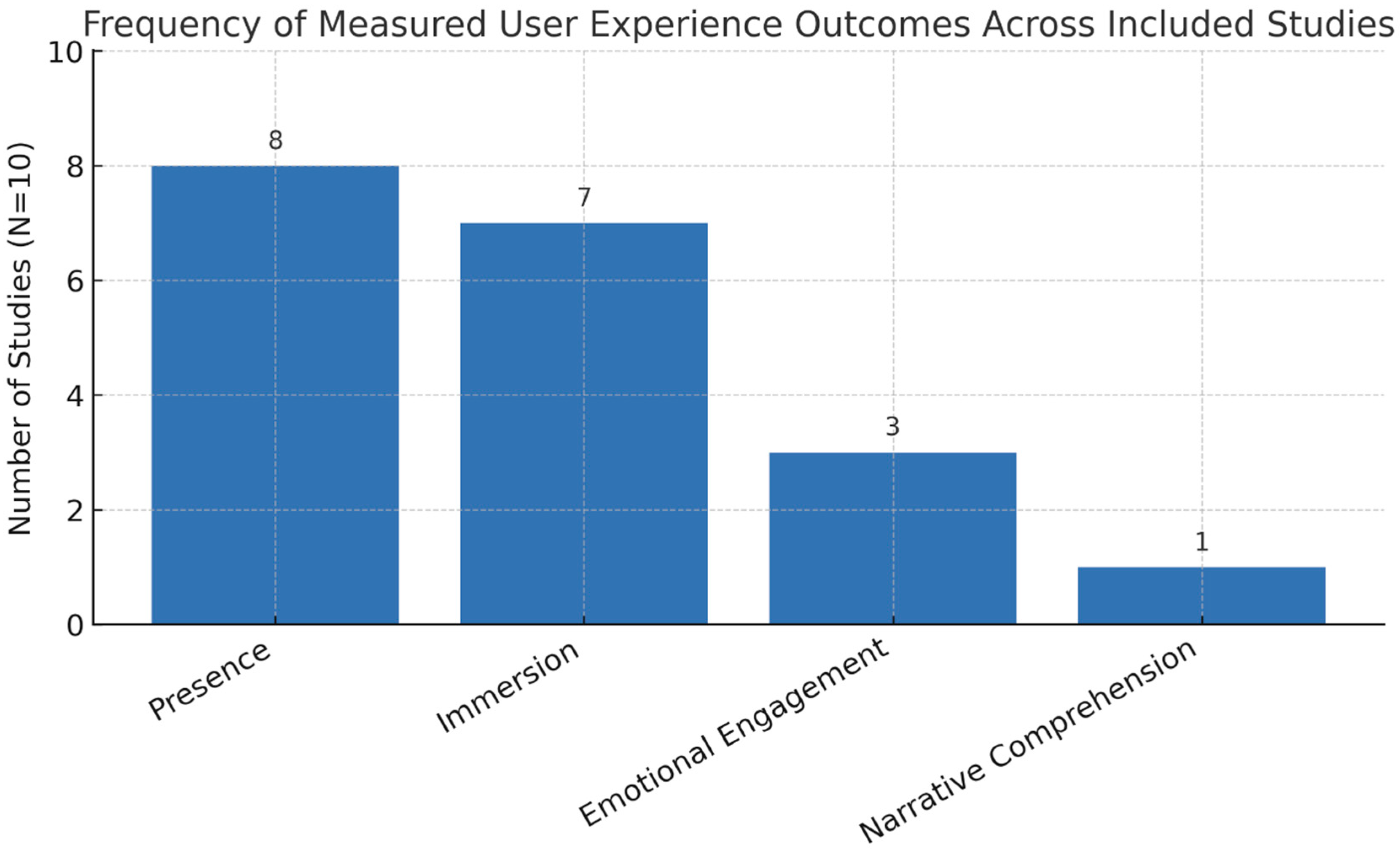 - Outcomes (O): At least one user-experience outcome relevant to narrative VR: presence, immersion, emotional/affective engagement, and narrative comprehension. Validated instruments or defined custom measures were accepted.